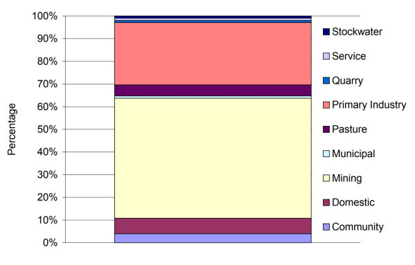The Ministry for the Environment’s consent database suggests that the total annual allocation of consented water takes on the West Coast is 271 million m3/annum, 90 per cent of which is sourced from surface water. Fifty-four per cent of consented water take is associated with the mining industry (Figure A1). The WCRC reports that although water take by the mining industry is consented, it is not consumptive because it is primarily related to “dredge ponds” and is returned to the environment following settling.44 If mining is ignored, consumptive take on the West Coast is 127 million m3/annum, just 1.3 percent of the national consented annual allocation (≈ 9,908 million m3/annum) of water take.