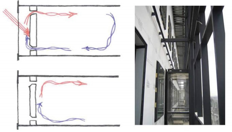 Over the height of a building, a significant temperature gradient can develop, particularly within the glazed layers of a double-skin facade. The superheated air then rises and is released by vents at the top of the facade. Air is vented from the interior spaces into the facade through automated vents in the inner skin.